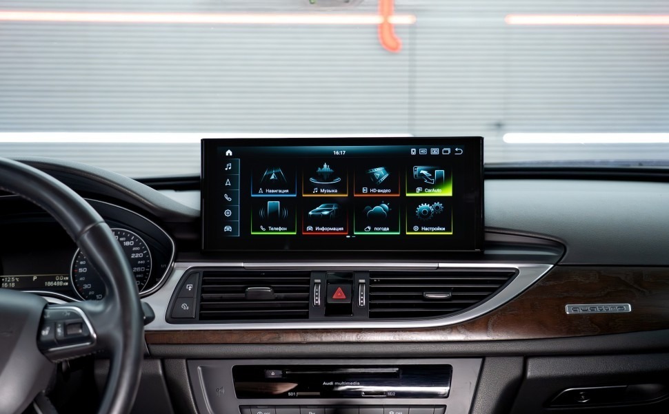 Замена заводского монитора Audi A6/A7 2012-2018 на 10.2 дюймовый емкостный сенсорный экран высокого разрешения (1920х720) с предустановленной ОС Android 14. Монитор устанавливается в штатное место автомобиля взамен оригинального монитора и органично вписывается в интерьер салона, при этом сохраняются все штатные функции: FM радио, работа кнопок на руле, штатная камера заднего вида, парктроник и т.д…