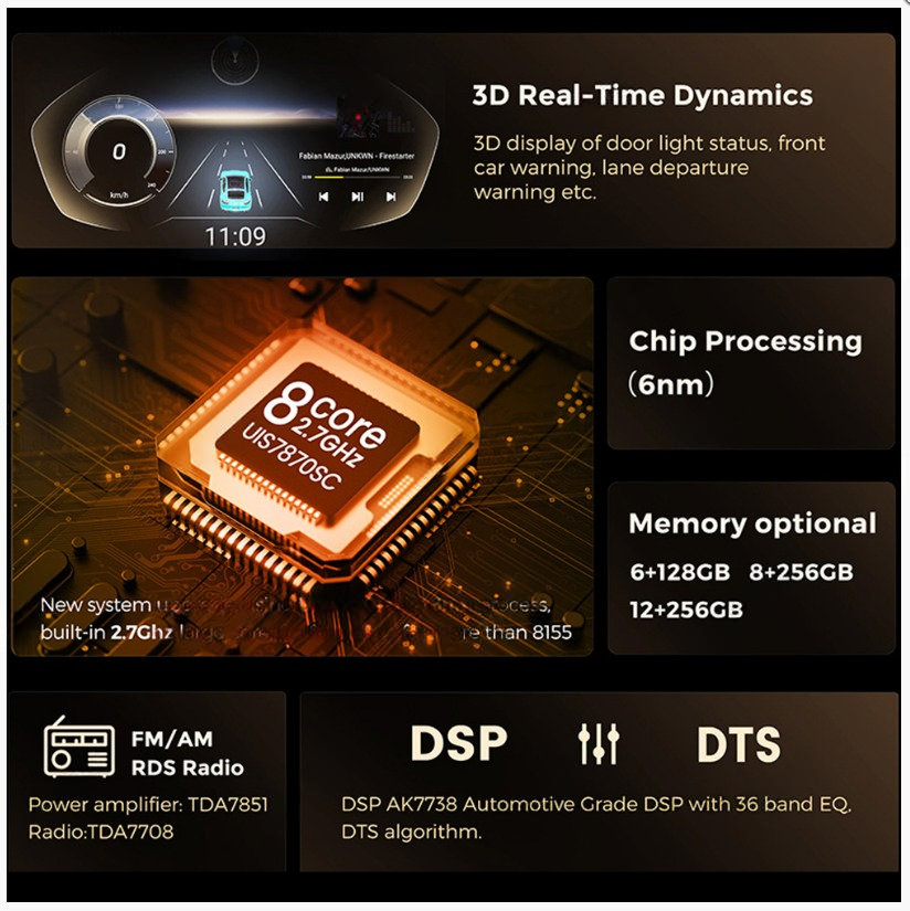 Звуковой чип DPS AKM7739 (DTS) DSP 43D сделают звук в вашей машине невероятно насыщенным и приятным. С помощью 32-полосного эквалайзера с регулировкой от 20Hz до 20kHz можно настроить звучание нужных частот в желаемом диапазоне. Даже штатная акустика в автомобиле будет звучать на высоком уровне.