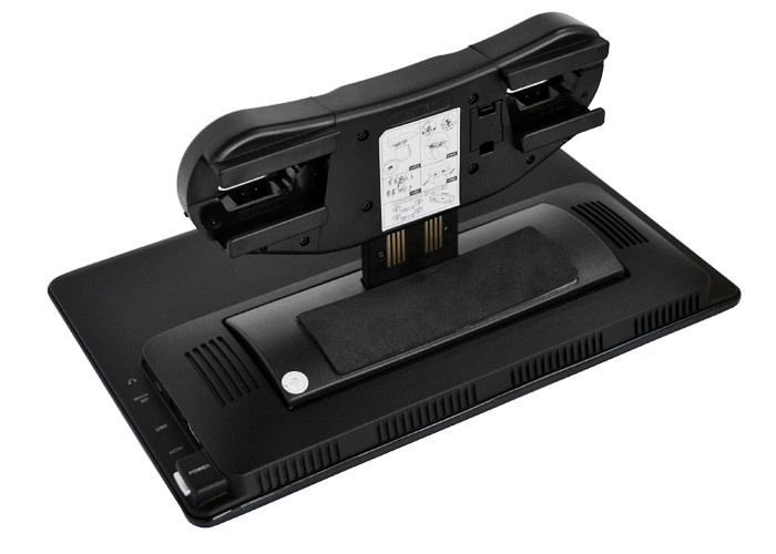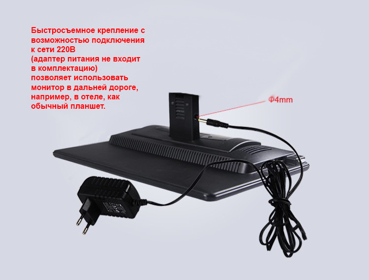 Модель навесного монитора ERGO ER14AN поставляется с уникальным быстросъемным креплением. Теперь главный провод подключения выходит не из монитора, как раньше, а скрытно подведен к разъему в нижней части крепежа. Это означает, что одним движением руки, монитор может быть снят и далее используйте его в отеле или в поездке к друзьям, подключив к обычной сети 220В через адаптер питания (не входит в комплектацию). Гнездо питания расположено на задней стенке устройства на ответной части крепежа, которое можно использовать как подставку, расположив монитор на столе. Важно отметить, что помимо питания в крепление монитора может быть также заведен видеовход (подключите цифровой ТВ тюнер или штатную магнитолу) и аудиовыходы на штатную акустику автомобиля.