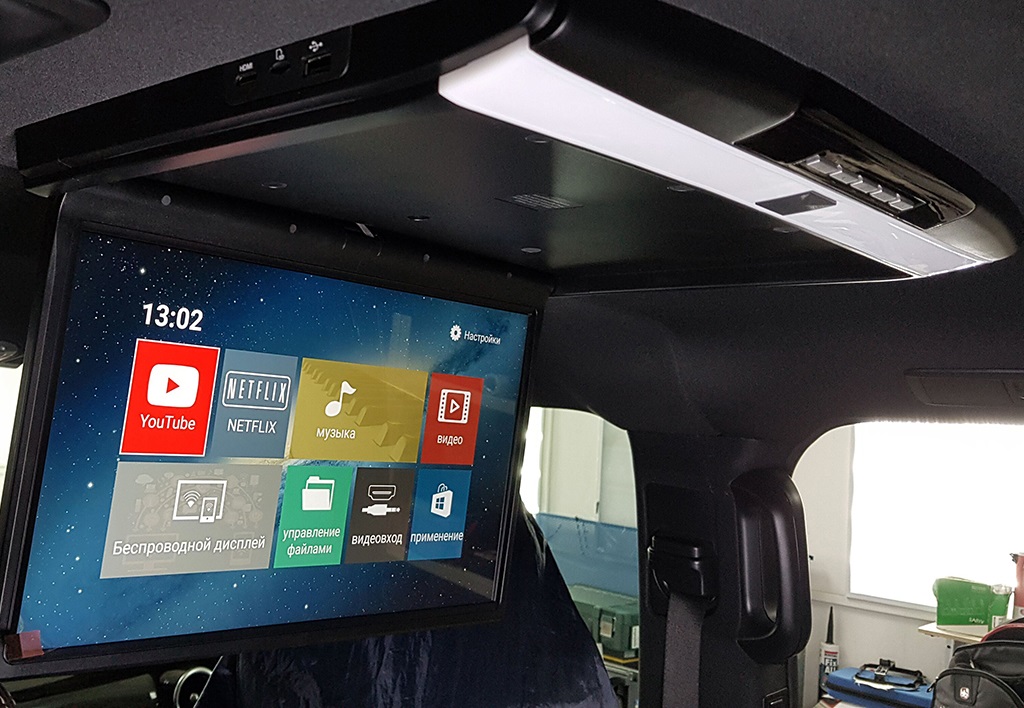 В потолочном мониторе есть встроенный модуль Wi-Fi! Раздав интернет с телефона, или подключив монитор к мобильному роутеру, вы и ваши попутчики всю дорогу можете коротать время за, уже привычном и удобном для нас, YouTube. Или же можно сразу из меню перейти в онлайн кинотеатр NetFlix!