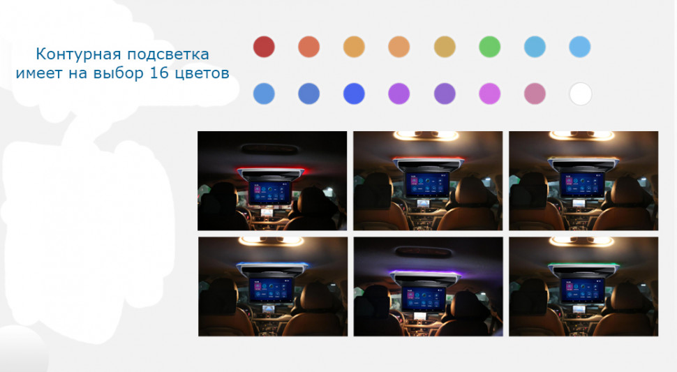 Дизайн потолочного монитора включает в себя контурную подсветку, которая имеет мягкий и приятный свет. На выбор предлагается 13 видов цвета.