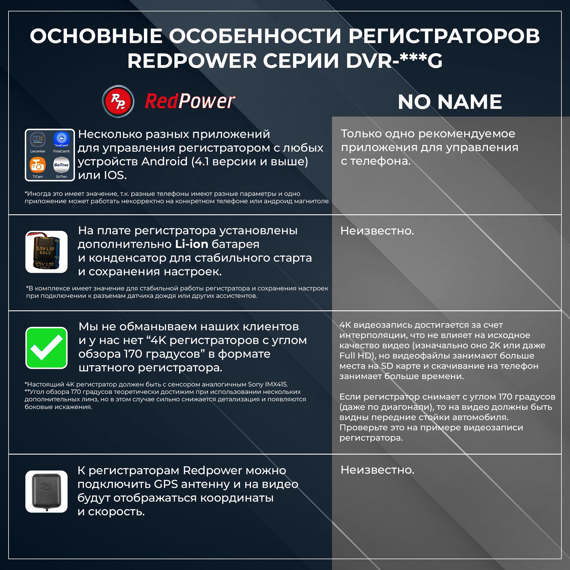 Компания Redpower рада представить новую линейку штатных регистраторов DVR-G серии. Отличия от N серии: новый чип позволяет записывать видео в разрешении 2,5K (было Full HD), новый сенсор Sony 335, возможность подключения GPS антенны и встроенный конденсатор.