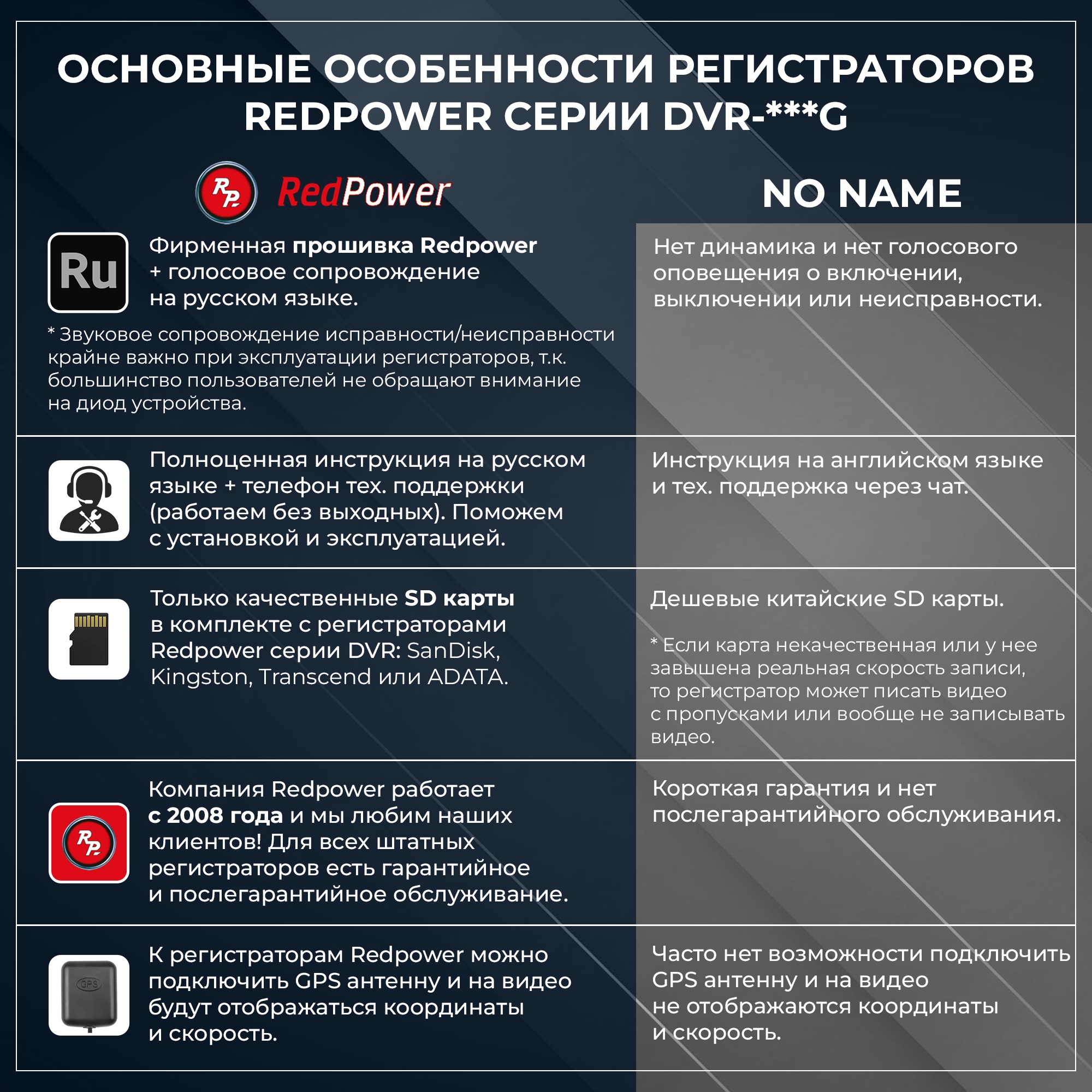 Компания Redpower рада представить новую линейку штатных регистраторов DVR-G серии. Отличия от N серии: новый чип позволяет записывать видео в разрешении 2,5K (было Full HD), новый сенсор Sony 335, возможность подключения GPS антенны и встроенный конденсатор.