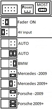 - площадка для джамперов, разъемы Power и MOST