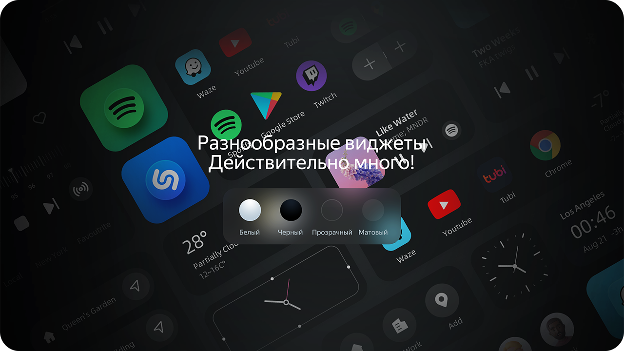 Получите полный контроль над интерфейсом! Более 100 различных виджетов для персонализации экрана позволяют создать уникальный рабочий стол. Расположите навигацию, музыку, климат-контроль и любимые виджеты так, как удобно именно вам.