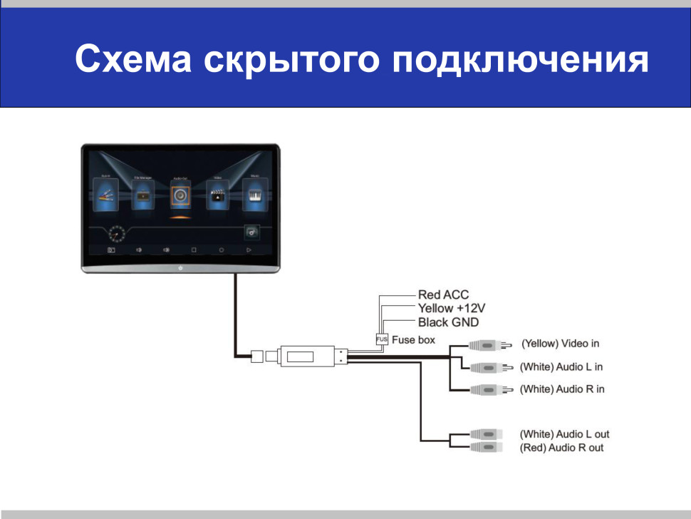 - Видеовход (AV) для подключения штатного головного устройства либо ТВ тюнера