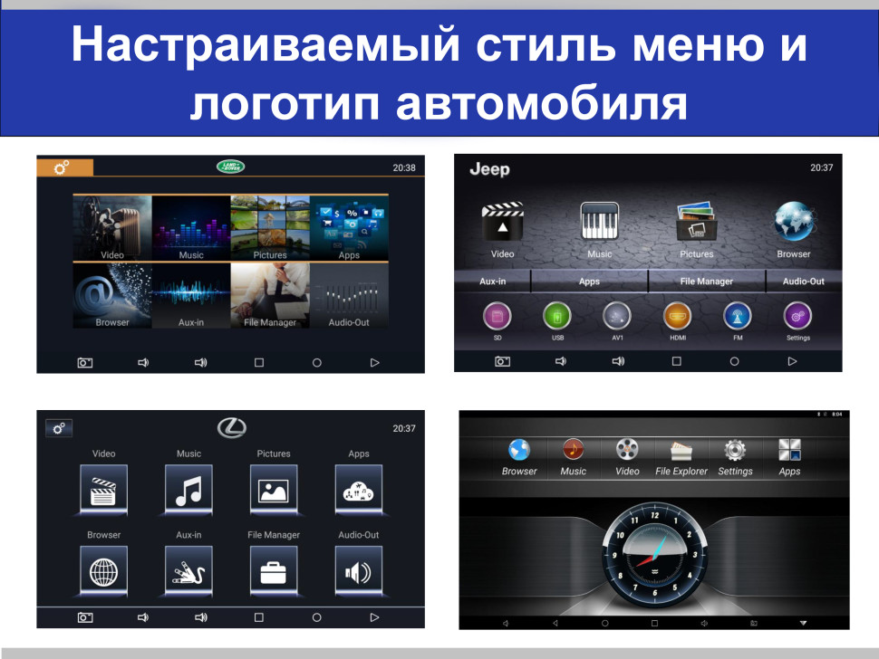 - Встроенные лаунчеры фирменных оболочек меню (BMW/AUDI/MERCEDES BENZ/LAND ROVER и др.)