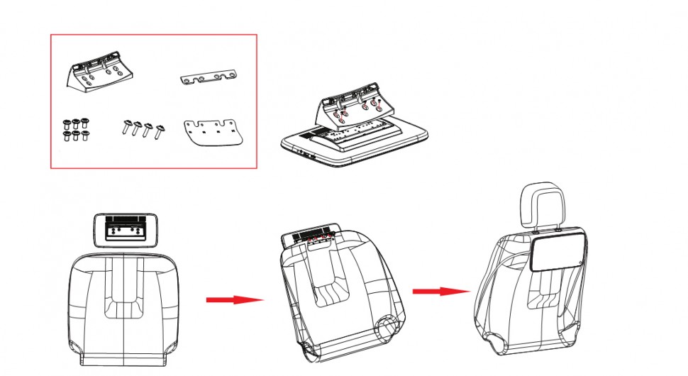 Крепление монитора предполагает установку не на металлические опоры подголовника, как это происходит с универсальными мониторами, а на жесткую пластиковую защиту спинки переднего кресла.