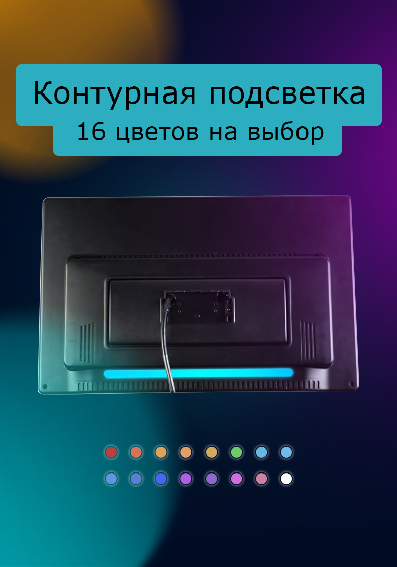Дизайн навесного монитора включает в себя контурную подсветку, которая имеет мягкий и приятный отраженный свет. Настройка режима работы происходит через меню настроек.