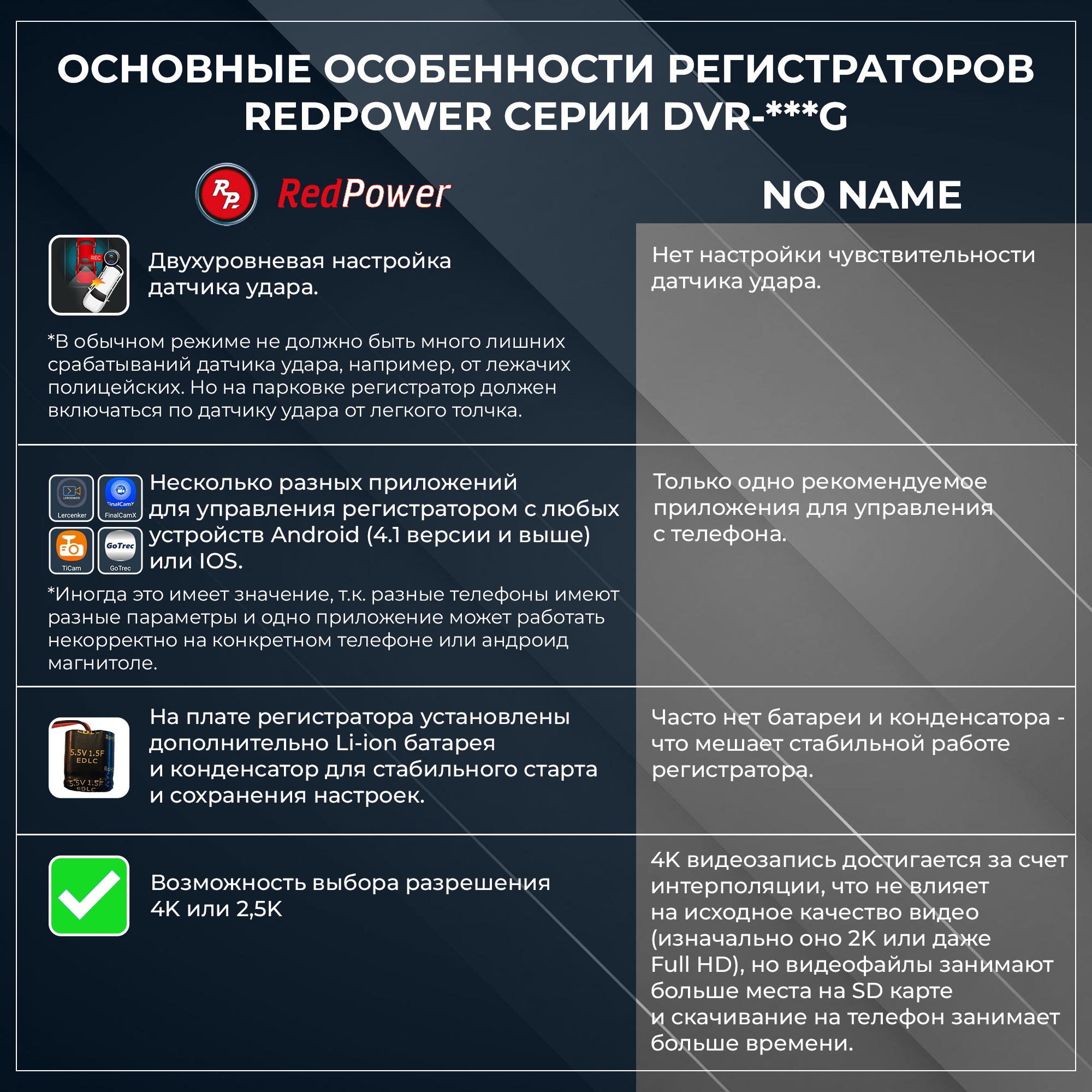 Компания Redpower рада представить новую линейку штатных регистраторов DVR-G серии. Отличия от N серии: новый чип позволяет записывать видео в разрешении 2K (было Full HD), новый сенсор Sony 335, возможность подключения GPS антенны и встроенный конденсатор.