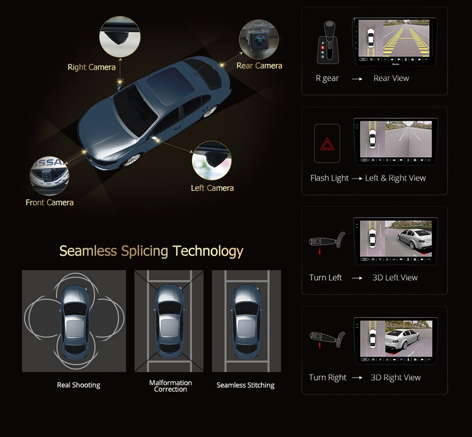 С помощью специального функционала мультимедийной системы - не требуется долгих и сложных настроек камер, достаточно использовать специальные полотна и блок автоматически сведет все камеры в единую картинку. В настройках программного обеспечения можно выбрать различный тип полотен, варианты отображения картинки (2D/3D), тип и цвет автомобиля.